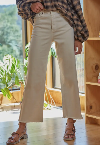 Our Brandie High Waisted Jeans are made of a soft woven cotton and feature a wide leg with frayed hem.