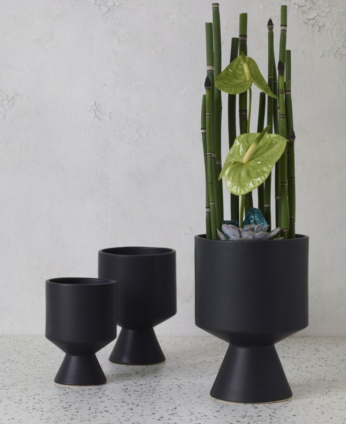 The Denil Pot is unique from silhouette to finish. The vase is first glazed, before speckles are applied by flicking glaze onto the pot by hand. A beautiful accent piece for any room.
