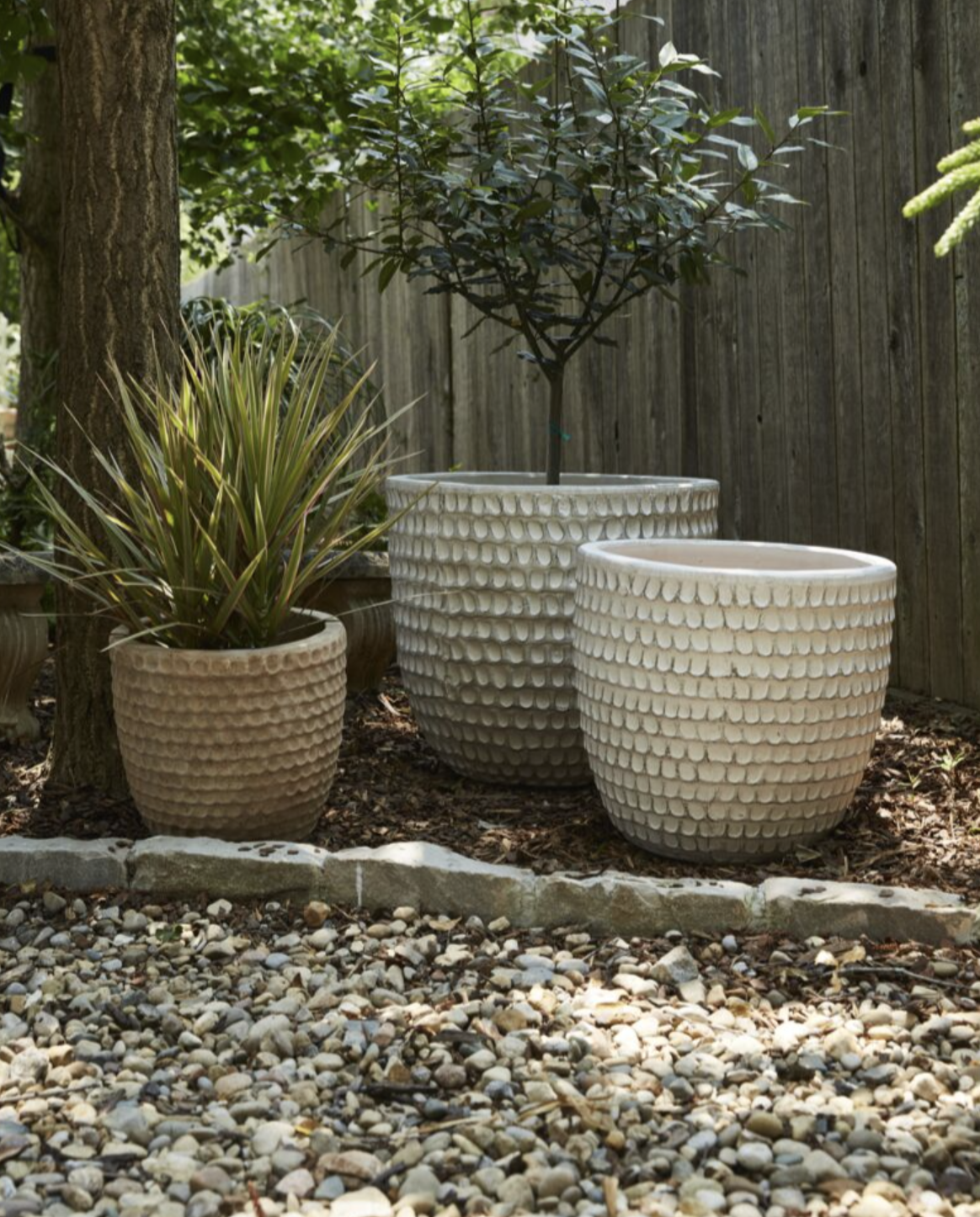 The classic Nelly Pot comes in two sizes of terracotta with a textured finish, offering a drainage hole and ideal for outdoor use.