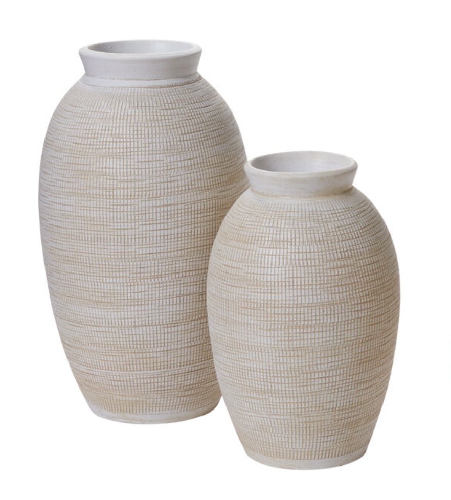 Add a touch of warmth to your fall and holiday decor with this white ceramic vase featuring delicate gold etching. Perfect for displaying seasonal flowers or greenery, this versatile piece comes in two sizes:
